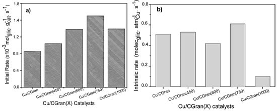 The concentration profiles over all the catalysts were similar.1,2-PDO was the main product. Acetol was observed as an intermediate product and 2-propanol was formed as a minor product. Other products observed as trace amounts include propanoic acid, 1,3-PDO, acetic acid, ethylene glycol and other polymerized compounds. The catalytic activity of the catalysts are represented as initial rate expressed in terms of mol of glycerol converted per gram of catalyst per unit time (mol glyc gcat −1 s−1) and is shown in Figure 7a. Also, the intrinsic rate expressed in terms of molecules of glycerol converted per active site of Cu per unit time (molec glyc ASCu −1 s−1) is shown in Figure 7b, and summarized in Table 4. Figure 7a shows an increase in catalytic activity of the Cu/CGran catalysts as the temperature of thermal modification of the support was increased up to 750 °C. This behavior indicates that thermal modification of the carbon support is beneficial to the overall activity by controlling the surface oxygen groups. As previously discussed, the more thermally-stable oxygen enhanced the dispersion of copper, confirmed by the increase in hydrogen adsorption capacity (Table 2) observed especially for Cu/CGran(600) and Cu/CGran(750) samples. On the other hand, when the catalytic activity is expressed in terms of the active site of Cu (intrinsic rate), this trend changes, as observed in Figure 7b.