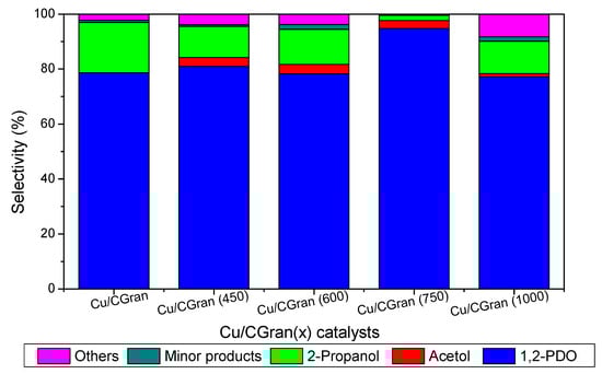 Figure 8 shows that the copper-based catalysts transformed glycerol mainly to acetol, 1,2-PDO and 2-propanol. In addition, it is observed that as the temperature of the thermal modification of CGran increased from 600 °C to 750 °C higher selectivity to 1,2-PDO is obtained. Cu/CGran (750) exhibited the highest selectivity towards 1,2-PDO. On the other hand Cu/CGran and Cu/CGran (1000) samples present smaller selectivity towards 1,2-PDO compared with the other samples.