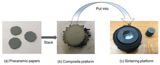 Preparation of preforms for spark plasma sintering: (a) cut preceramic paper; (b) stacked preceramic paper sheets with fiber layers; (c) sintering platform.