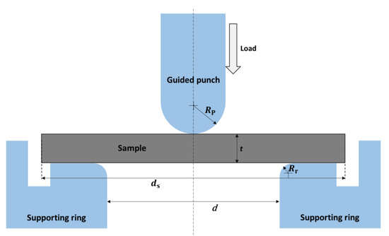 Flexural strength is the most important indicator for evaluating the mechanical properties of ceramic structural materials [26]. Considering that the size of the produced samples is smaller than the minimum size required for the conventional strength test method of brittle materials (not less than 35 mm [27]), and the fibers are distributed in a two-dimensional grid inside the sample, the samples are not suitable for conventional three-point and four-point point flexure tests. Borrowed the design of Manahan et al. [28,29,30,31], in this work a special device is prepared for the small punch (SP) strength test, which is particularly suitable for the testing of very small size samples. The SP test was performed using Al-7000M machine (GOTECH, Taichung, China). Three round pieces of 7.9 mm in diameter were tested for each composite series. The schematic of this device is shown in Figure 2, where Rp is the radius of the punch tip; Rr is the radius of the fillet inside the supporting ring; d is the inside diameter of the supporting ring; t is the thickness of the sample; ds is the diameter of the sample. The parameters of the device used for SP test: Rp = 1 mm, Rr = 0.5 mm, d = 4 mm. In the SP strength test, the disc-shaped sample was supported and centered by a ring and placed centrally by a guided punch with a hemispherical tip. The resulting stress field is axisymmetric. The applied load and displacement of the guided punch are recorded during the test.