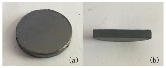 The appearance of the silicon carbide fiber/paper-derived silicon carbide (SiCf/SiCp) composite sintered at 2100 °C and 40 MPa for 10 min. (a) plan view; (b) cross section view.