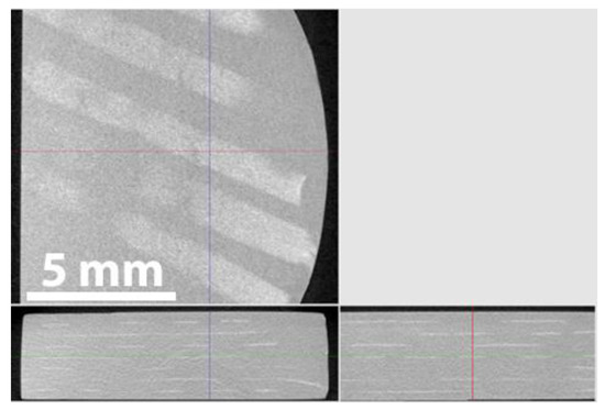 Computed tomography (CT) slices of the SiCf/SiCp composites: parallel (top) and transverse (bottom).
