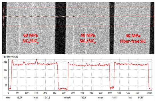 Comparison of the X-ray density of the samples by the integrated profile show no visible difference between the SiCf/SiCp composites sintered at 40 and 60 MPa, except that 60 MPa shows slightly higher average density (Figure 6). The fiber-contained region has higher X-ray density compared to the paper-derived SiC matrix.