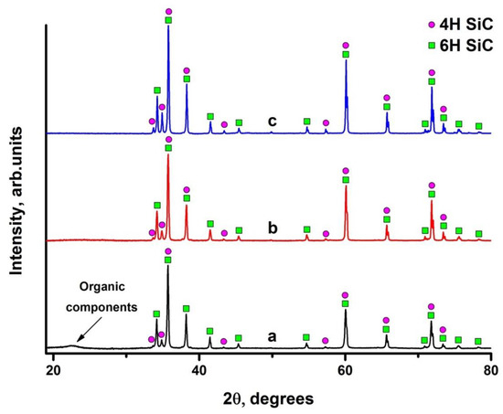 The amorphous phase disappears after spark plasma sintering (Figure 10b,c). This is associated with decomposition of hemicelluloses and celluloses at 220–315 °C and 315–400 °C, respectively. At temperature above 400 °C, the charred remains of the pulp fibers start to decompose, and finally they are completely decomposed at 450 °C [26,34]. Lignins decomposes within the wide range of 160–900 °C [35]. This indicates that the organic components in the preceramic papers are completely removed during the sintering process. The phase ratio in the sintered paper-derived SiCp and SiCf/SiCp composites slightly changes after SPS process. The content of 4H phase increases to 22 vol.% while content of 6H phase reduces to 78 vol.%. Such distribution between phases is associated with decomposition of organic components during sintering. Obviously, the sintering process has hardly changed the phase composition of the material. The addition of SiC fibers does not change phase composition of the SiC ceramic composites.