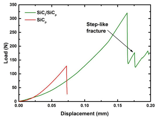 The loading-displacement curves of the fiber-free paper-derived SiC and the SiCf/SiCp composite are shown in Figure 11. It can be observed that the curve of the fiber-free SiC ceramic indicates brittle fracture of the material. Although the loading curve of the fiber-reinforced composite has similar behavior, the curve did not drop down directly after reaching the highest loading point. The fracture mode in this case is non-catastrophic fracture (step-like fracture), the composite materials exhibit quasi-ductility rather than pure brittleness. The quasi-ductility of the composite is caused by the addition of fibers and layered structure of composite, which is consistent with the results of Nakazato et al. [5] and Nozawa et al. [4].