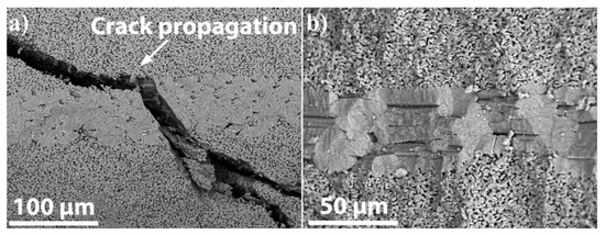 The stress-induced micro-cracks appeared during the SP bending test are observed on the fracture surface of the SiCf/SiCp composite (Figure 13a). During the fracture test, the micro-crack was generated from the top to the bottom. It can be observed that the path of the micro-crack is hindered by the fiber region: the micro-crack is deflected tangential to the interface between matrix and fiber as it approaches the interface, then “refracted” when it enters the fiber region from the matrix. When the micro-crack leaves the fiber region and enters the matrix, it was “refracted” back to the original direction and splits into two cracks. This means that when a micro-crack grows from the matrix to the interface, the crack deviates and splits at the interphase to greatly extend the micro-crack propagation path and dissipate energy. This is consistent with the theory described in the literature of Masuda et al. [41]: the micro-crack initiated from the surface sample propagates to the fiber regions and the crack is arrested by aligned fibers. The micro-crack has to cut through the fibers or the crack propagates between the interfaces. Only partial stretching of fibers between the neighboring fibers was observed (Figure 13b). Thus, the partial sintering of fibers with SiC matrix hindered fiber/matrix detachment. The possible fracture mechanisms responsible for improved flexural strength and stepwise fracture of the SiCf/SiCp composite are crack deflection, crack branching etc. Future research will focus on the formation of a protective coating (PyC) to further improve the mechanical properties of such composites due to pull-out effect.
