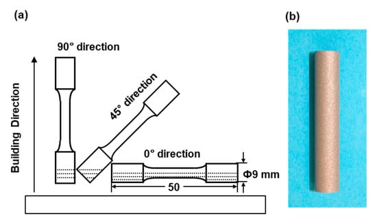Cylindrical specimens with a diameter of 9 mm and a height of 50 mm were fabricated by laser sintering under the above conditions using EOSINT M 290 and EOSINT M 270 machines on support materials using the CP Ti G 2 powders. As shown in Figure 1, to investigate the effect of the building direction of laser sintering, the building direction was set to 0° (hereafter, 0° direction), 45° (45° direction), and 90° (90° direction) for the base plate using the CP Ti G 2 powders [1]. CP Ti G 2 cylindrical specimens after laser sintering were heat-treated at 700 °C for 2 h followed by air cooling. This heat treatment (annealing) at 700 °C (±10 °C) for 2 h is recommended by the FlexLine EOS material data. These conditions are also widely used for wrought Ti materials [14]. In the actual laser sintering of dental prostheses, a certain percentage of virgin powder is added. The number of repeated uses of the same powder of up to 10 times in this work was decided considering the effect of a small amount of residual powder. In the case of laser sintering from two to nine times, two cylindical specimens with a diameter of 9 mm and a height of 50 mm were laser-sintered in the 90° direction in each sintering.