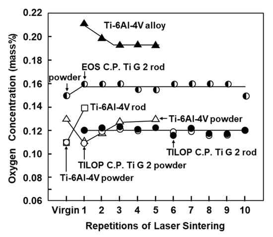 Figure 3 shows the oxygen (O) concentration in laser-sintered EOS CP Ti G 2 rods, laser-sintered TILOP CP Ti G 2 rods, and TILOP CP Ti G 2 powders as a function of the number of times of repeated laser sintering. The bars in Figure 3 indicate the standard deviation. In Figure 3, the results for the Ti-6Al-4V alloy were taken from the literature [6]. The increase in the O concentration of the laser-sintered CP Ti G 2 rods was found to be negligible. The O concentration in the laser-sintered Ti-6Al-4V alloy slightly increased from 0.11% in the virgin powder to 0.14% in the once-sintered alloy. On the other hand, in a previous report, the O concentration of the laser-sintered Ti-6Al-4V alloys was increased to up to 0.21% by laser sintering [6]. In particular, almost no increase in O concentration was observed after sintering 10 times. Thus, it was found that CP Ti powder can be recycled up to 10 times in the laser sintering of CP Ti. These tendencies were similar to those obtained with laser-sintered Co–Cr–Mo alloys [1].