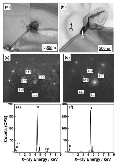 TEM images of transverse sections of (a,b) once-sintered TILOP CP Ti G 2 built in 90° direction; (c,d) electron beam diffraction patterns obtained at the location indicated by p (precipitation) and m (matrix) in (b), respectively; (e,f) EDS patterns of precipitate indicated by p and m in (b).