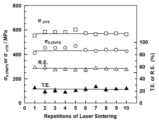 Figure 8 shows the mechanical properties (σ0.2%PS, σUTS, TE, and RA) of laser-sintered EOS CP Ti G 2 rods as a function of number of the repetitions of laser sintering. Hardly any effect of the number of repetitions on σ0.2%PS, σUTS, TE, and RA was observed up to 10 repetitions.