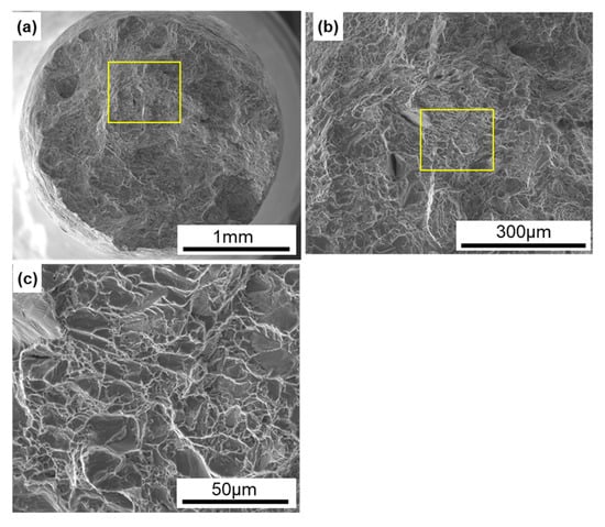 Figure 9 shows SEM images of the fracture surfaces of laser-sintered CP Ti G 2 after the tensile test. Magnified images of the rectangular areas in Figure 9a,b are shown in Figure 9b,c, respectively. Dimples were observed on the fracture surfaces, as shown in Figure 9c. Similar fracture surfaces were observed on all the other laser-sintered CP Ti G 2 specimens.