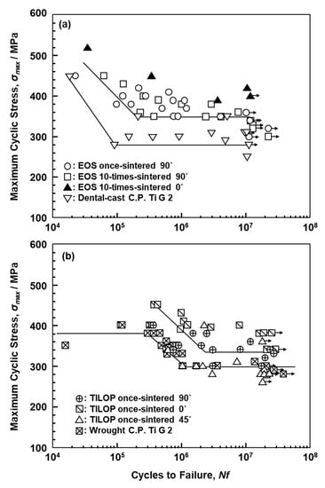 Figure 10a,b shows S–N curves of annealed CP Ti G 2 rods ((a) EOS and (b) TIROP powders) after laser sintering and dental-cast CP T G 2 (shown in Figure 10a). Figure 10b also shows S–N curves of CP Ti G 2 annealed after hot forging taken from the literature for comparison [39]. The fatigue strengths of the 90°-, 45°-, and 0°-direction-built CP Ti G 2 rods were ~330, ~290, and ~380 MPa, respectively. The effects of the laser sintering direction on σFS of CP Ti G 2 were considered to be small because the anisotropy factor of the fatigue strength was 0.87 ((fatigue strength in 90° direction)/(fatigue strength in 0° direction)). This value was similar to those obtained for the laser-sintered Co–Cr–Mo alloy (0.83–1.0) [1] and the anisotropy of σ0.2%PS caused by forging of Ti-15Zr-4Nb-4Ta alloys (0.83–0.94) [40]. Thus, it was considered that the effect of the laser sintering direction is negligible for CP Ti G 2. The fatigue strength of the 90°-direction-built 10-times-sintered CP Ti G 2 was ~340 MPa.
