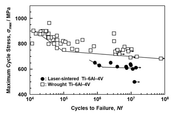 Figure 11 shows S–N curves of laser-sintered (as-built) Ti-6Al-4V alloy and wrought Ti-6Al-4V alloy annealed at 700 °C for 2 h after hot forging; the curve for wrought Ti-6Al-4V alloy is taken from the literature for comparison [39]. The fatigue strength of the 90°-direction-built Ti-6Al-4V alloy was ~600 MPa, which is close to that of wrought Ti-6Al-4V alloy. The improvements in the fatigue strength and durability of dental prostheses (such as partial dentures and clasps) are effective in improving the needle-like structure and reducing the thermal stress caused by laser sintering. We would like to investigate in detail the other orthopedic applications of laser-sintered Ti-6Al-4V alloy in future studies.
