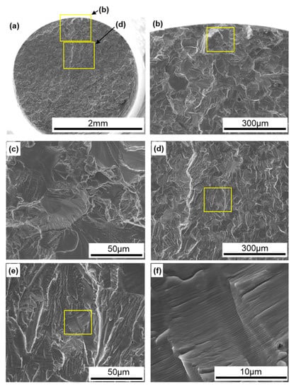 Figure 12 shows SEM images of the surface of 0°-direction-built CP Ti G 2. A fatigue crack developed with a fatigue fracture from the periphery of the specimen, and river-like patterns and striations were observed, as shown in Figure 12e,f [38].