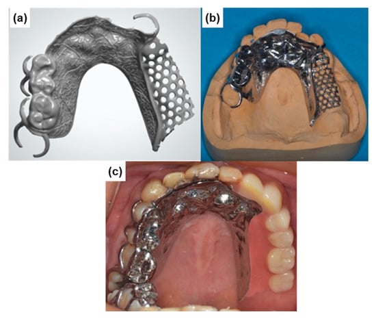Partial dentures manufactured by laser sintering with CP Ti G 2 powder. (a) laser-sintered metal frame; (b) polished metal frame; (c) partial denture.