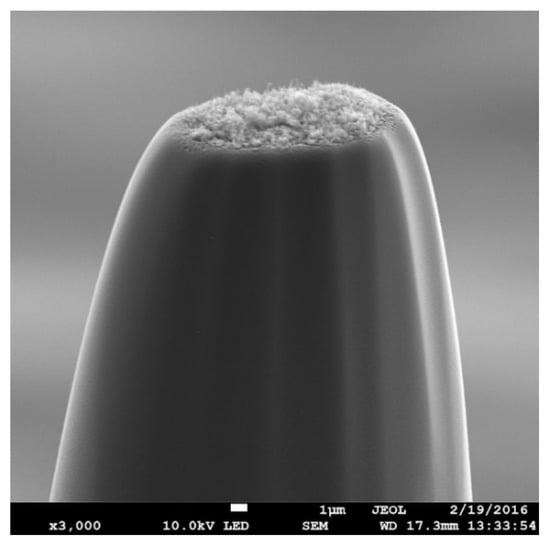 At the same time, the question of the effect of the emitting tip surface on the emission properties remains topical. At present, it is possible to modify and nanostructure the surface of porous carbon glass-like materials [], which makes it possible to sharply increase the field enhancement factor β by 4–5, because a thin surface layer of the emitting material plays a decisive role in autocathodes. This layer may be compared with a film of a thickness of several tens of nanometers, as shown by Gay et al. []. A typical scanning electron microscope (SEM) image of the emitting surface of a nanoporous carbon glass-like emitter is shown in Figure 1. This image was taken using a JEOL JEM-2100 Plus transmission electron microscope at an accelerating voltage of 10 kV. The diameter of the tip at the base is 32 microns; the diameter of the apex is 16 microns. As can be seen in the figure, the working surface of the emitting tip is a rough structure which ensures a high density of field emission current. The technology for producing such films using laser radiation is described in detail by Bessonov et al. [].