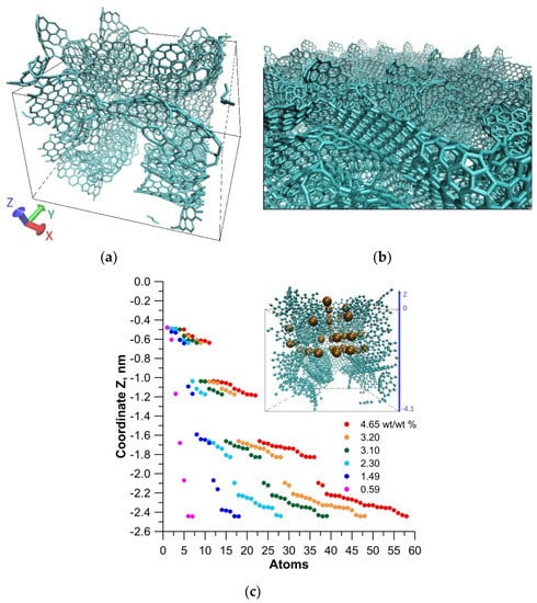The modification of the surface with potassium atoms was carried out as a result of bombarding the surface of the glass-like carbon with potassium atoms using the molecular dynamics (MD) SCC-DFTB method under normal external conditions []. The calculations were performed using open-source Kvazar []. The initial conditions were taken from experimental data [], in which the beam energy was from 50 to 150 keV at a beam density of 1015–1017 atom/cm2. We considered the case when the beam density was 1016 atom/cm2, and the energy was equal to 100 keV. The velocity of the atoms was 0.70 m/s under such conditions. The main regularities in filling the pores and reaching the maximum potassium concentration were found as a result of a series of 20 numerical experiments. This process was accompanied by temperature fluctuations within 300–800 K. It was established that the maximum possible potassium concentration by mass was 4.65% for this structure of glass-like carbon surface. Figure 2c shows the course of filling the nanopores with potassium atoms. The ordinate represents the depth at which the nanopores were located (negative direction of the Z axis) and the abscissa—the number of potassium atoms filling these nanopores. One can see a clear regularity in the filling of the nanocavities of the glass-like carbon surface. Even at a low concentration of 0.59%, two potassium atoms reached a depth of 2.5 nm with respect to the surface layer. During the process of bombarding the surface of glass-like carbon, all the nanocavities were uniformly filled with potassium atoms. This is well demonstrated by the inset of Figure 2c, which corresponded to the maximum concentration, where the potassium atoms uniformly filled the surface, deep, and middle cavities (potassium atoms are marked with ocher-colored balls). Thus, all pores were filled at a depth of 2.5–2.6 nm.