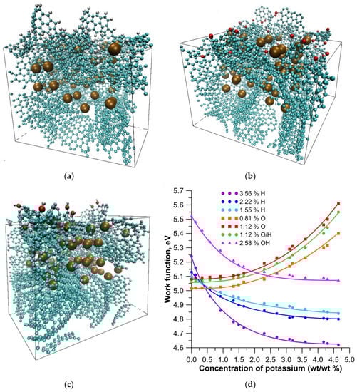 As can be seen in Figure 3d, with an increase in the concentration of hydrogen atoms on the surface, the work function decreased against the background of increasing potassium mass fraction. Secondly, oxidation impaired the emission properties of the surface regardless of the concentration of oxygen atoms. The work function only increased, in particular by 0.5–0.6 eV, regardless of the number of oxygen atoms and the degree of presence of potassium atoms. Other variants of impurity atoms showed a noticeable deterioration of the emission properties, regardless of the concentration. The results of the calculations showed that the presence of OH groups increased the work function by 0.5 eV, in comparison with hydrogen. However, the modification of pores with potassium made it possible to compensate increasing work function, as can be seen in Figure 3d (curve with triangles). It should also be noted that the presence of both O atoms and H atoms on the surface simultaneously, as with oxidation, only contributed to an increase in the work function.