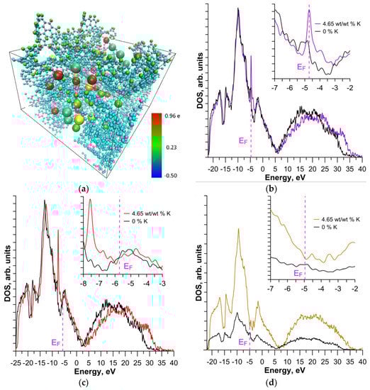 Figure 4a shows a super-cell with impurity hydrogen atoms (3.56% H) and a maximum mass fraction of 4.65%. The charge is displayed in color—the potassium atoms change color from red (charge +0.96 e) to yellow green (+0.50 e) and green (+0.26 e). The carbon framework had a practically uniformly distributed charge −0.1 e to −0.5 e, therefore it is displayed in blue. Hydrogen atoms, like potassium, gave up a partial charge, so they are shown in green. Their charge varied from +0.1 to +0.23 e. Thus, analysis of the electron charge density distribution data (data in Table 1) and comparison with the graphs in Figure 3d shows that the minimum work function was observed for the case of the maximum transfer of electron charge to the carbon framework. This was due to an increase in DOS at the Fermi level. Figure 4b shows DOS for the case of a maximum displacement of the Fermi level upward and a corresponding decrease in the work function (lilac curve). It can be clearly seen that in this case the DOS peak fell on the Fermi level, which improved electrical conductivity and reduced the work function. The gray color represents DOS surfaces with 3.56% H, but without potassium atoms. When oxidizing the surface, even pouring potassium into the pores did not improve the emission properties. Figure 4c shows DOS for the oxidized surface with a concentration of 1.12% O (gray curve) and for the same surface at the maximum mass fraction of potassium (red curve). It can be seen that at the Fermi level the DOS of the surfaces with potassium were smaller in comparison to the case without potassium. For comparison, we calculated the DOS of a clean surface (without impurity atoms) and a surface with the maximum mass fraction of potassium. These calculation results are presented in Figure 4d. The DOS increased at the Fermi level.