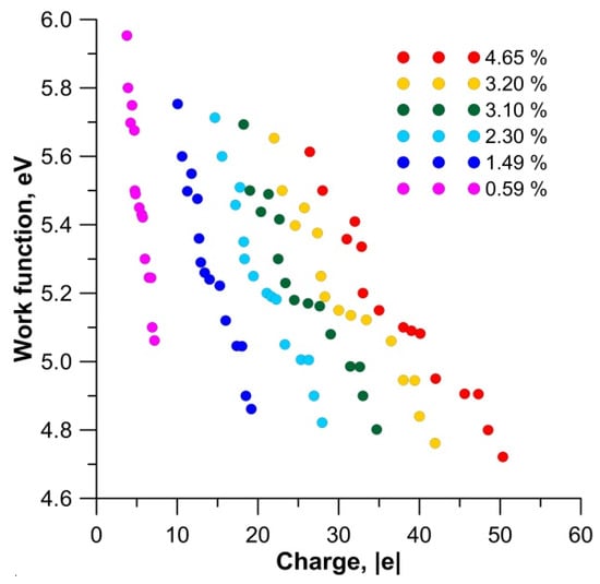 Calculations of the charge of the carbon framework in all considered cases of surface modification showed that there was a clear regularity. As the electron charge flowed over the carbon framework, the work function decreased. Figure 5 shows the graphs of the change in the work function of the film with an increase in charge on the carbon framework for various cases of filling the nanopores with potassium.