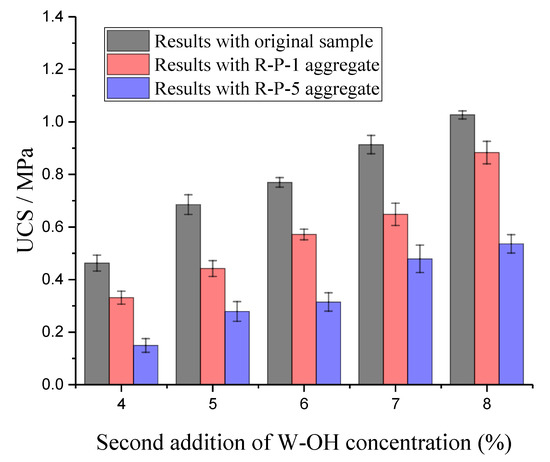 The measured unconfined compressive strength for the five type samples in Table 1 is shown in Table 2. It is clear that the compressive strength will increase with the concentration of the W-OH solution, which is inconsistent with the findings in reference [72]. The increased W-OH concentration will lead to a higher W-OH amount in the composites, which can cover more surface area of the Pisha sandstone aggregate, generate more internal links, and thus lead to higher compressive strength.