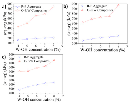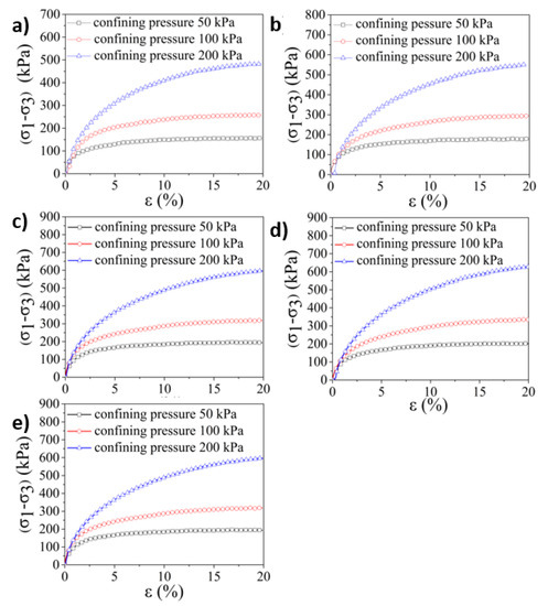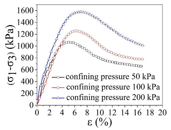 The triaxle compressive tests were further conducted with the remolded Pisha sandstone, original Pisha sandstone/W-OH composites, and remolded Pisha sandstone/W-OH composites separately to better understand the compressive performance under confining pressure. The triaxle compressive tests were conducted under the unconsolidated-undrained condition and the confining pressure (50 kPa, 100 kPa, and 200 kPa) was selected based on the local crustal stress condition. The obtained stress–strain relationship for the remolded Pisha sandstone is shown in Figure 6. The clear strain hardening can be observed for all the remolded Pisha sandstone samples as shown in Figure 6, which is inconsistent with the performance of loose sandy soil [74] and indicate the internal connections generated by the W-OH have been almost completely destructed. On the contrary, the straining soft performance can be observed for the original Pisha sandstone/W-OH composites as shown in Figure 7, which is similar to the triaxle property of the soft rock [75]. Furthermore, it is also clear that the failure pressure for all the five types of remolded Pisha aggregate increases with the confining pressure as indicated in Figure 6, which is also caused by the hardening effect of the loose remolded Pisha sandstone. Another observed phenomenon is that the failure stress of remolded Pisha sandstone can increase with its original W-OH concentration. This result can be caused by the enhanced internal friction caused by the remained W-OH polyurethane [76] on the surface of the remolded Pisha sandstone.