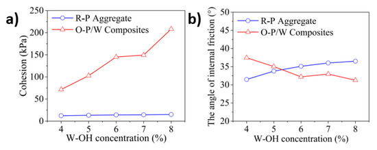 In this study, the stress when the axial strain reaches 15% was defined as the failure stress based on the recommendation in the reference [77]. The comparison of the failure stress between the remolded sandstone and the original Pisha/W-OH composites was then conducted and the results are indicated in Figure 8. At the confining pressure of 50 kPa, the failure stress of the original Pisha sandstone/W-OH composites increases from 433.7 kPa at 4% W-OH concentration to 843.7 kPa at 8% W-OH concentration. This result is in accordance with the research findings based on unconfined compressive strength shown in Table 2. Furthermore, the reduction of failure stress because of remolding was 64.2% and 75.2% respectively for the 4% and 8% W-OH specimen at the confining pressure of 50 kPa. The confining pressure also significantly affects the failure pressure. Under the confining pressure of 200 kPa, the failure stress of original Pisha sandstone/W-OH composites increases from 904.3 kPa at 4% W-OH concentration to 1171.3 kPa at 8% W-OH concentration. It is clear that the increased confining pressure will lead to higher failure stress and relative lower strength reduction ratio. A more detailed study was conducted to determine the cohesion strength and friction angle based on the Mohr-Coulomb failure criterion [78] and the obtained results are shown in Figure 9. The cohesion strength for the original Pisha/W-OH composites at 4%, 5%, 6%, 7%, and 8% W-OH concentration were 71.9 kPa, 101.1 kPa, 145.4 kPa, 148 kPa, and 208.9 kPa respectively. The related reduction rates on cohesion strength caused by remolding increase from 83.0% at 4% W-OH concentration to 92.9% at 8% W-OH concentration respectively. The increase of the strength reduction rate is because more internal links will be broken during remolding for the samples prepared with a higher concentration of W-OH solution. Meanwhile, the friction angle for the remolded samples increases from 31.4° at 4% W-OH concentration to 36.5° at 8% W-OH concentration. The increase is caused by the enhanced internal friction because of the higher amount remained W-OH material [76] on the surface of the remolded Pisha aggregate.
