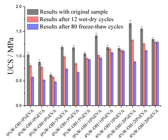 Besides the performance evaluation on mechanical performance, further studies on the durability performance of the EVA modified W-OH composites were also conducted. Based on the local climate condition in Inner Mongolia, the durability performance under wet-dry and freeze-thaw cycles were examined. The evaluation was conducted by comparing the unconfined compressive strength before and after the durability tests as shown in Figure 10. The results indicated the lowest strength reduction was achieved by the composites with 10% EVA modified W-OH. The strength for the samples containing R-P-1 and R-P-5 type remolded aggregate were reduced by 2.21% and 2.86% respectively by the 12 wet-dry cycles, and 8.69% and 4.24% separately by the 80 freeze-thaw cycles as shown in Figure 9. Although higher strength was achieved for the samples with 20% EVA modified W-OH composites, the better durability performance was achieved by the samples with 10% EVA modified W-OH. The results are because of the observed phenomenon in the former reference that the higher EVA concentration can lead to agglomeration in the W-OH materials [69]. The agglomeration will lead to uneven distribution of mechanical properties and thus cause stress concentration under the recycled environmental or mechanical loading [79], which can then lead to reduced durability performance.