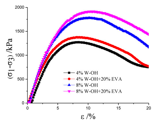 Furthermore, the triaxle compressive tests were conducted for the EVA modified W-OH composites. The obtained results are shown in Figure 11. It is clear that the added EVA can also enhance the triaxle compressive strength of the W-OH composites, which is inconsistent with the unconfined compressive strength. Specifically, it should be noticed that the samples with remolded Pisha aggregate has higher triaxle compressive strength compared to the composites with original Pisha aggregate as shown in Figure 11. This is caused by the higher friction angle of the remolded Pisha aggregate as shown in Figure 9.