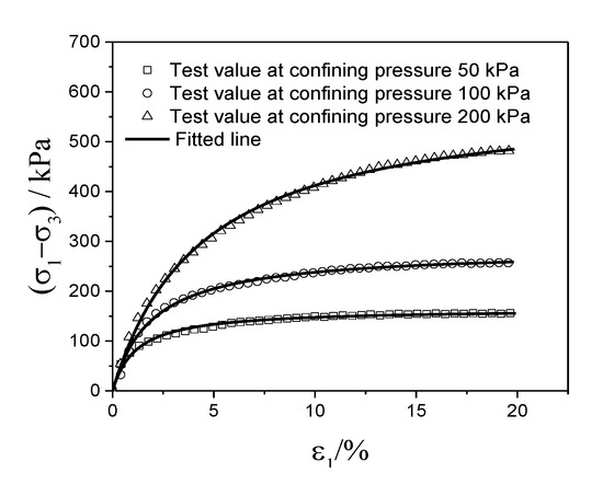 One example of the fitted results based on Equation (1) is demonstrated in Figure 12. It is clear that the test curve and the fitting curve are in good agreement. The correlation coefficients for all the fitted samples are all above 0.97, which further supports the compatibility of the Duncan-Zhang model.