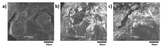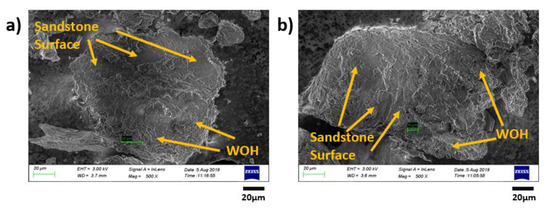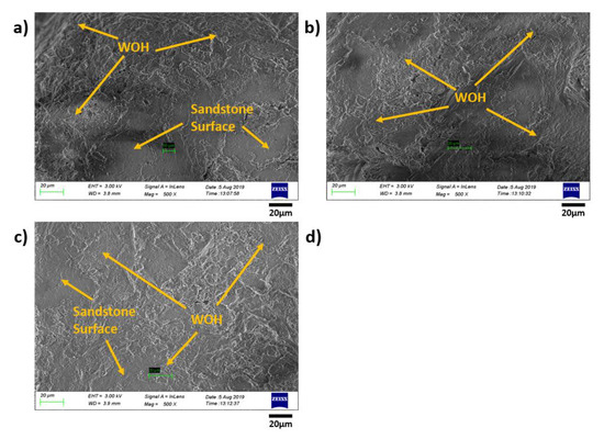 Further studies were conducted for the morphology analysis of the original and remolded Pisha aggregate. The examination was conducted with SEM and the results are shown in Figure 13. It is clear that the typical layer structure for the sandstone [81] can be observed in Figure 13a. The W-OH and sandstone can be clearly separated by the surface morphology difference, which has also been adopted in reference [82]. The area covered by the remained W-OH increases with the W-OH concentration can be found for the remolded sandstone aggregate shown in Figure 13b,c. The poor adhesion between the remained W-OH and new W-OH materials can lead to the decreased performance of the remolded Pisha/W-OH composites. Similar issues were also reported for the recycled concrete aggregate with remained hydrated cement on the aggregate surface [83,84]. Compare to the R-P-1 type aggregate, the higher surface area in the R-P-5 type aggregate is covered by the remained polyurethane, which can explain the difference in strength reduction rate shown in Figure 5. The morphology analysis was further conducted for the remolded aggregate re-solidified with original W-OH and EVA modified W-OH respectively. The related results are shown in Figure 14 and Figure 15 respectively. It is clear the added EVA can enhance the surface area covered by the W-OH as shown in Figure 14 and Figure 15. These results support the assumption that the EVA can lead to the higher internal bond between the remolded Pisha aggregate.