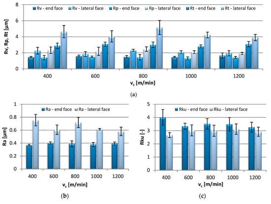 Figure 2 contains bar graphs presenting the influence of the cutting speed change, vc = 400–1200 m/min, on the values of the end-face and lateral-face 2D roughness parameters.