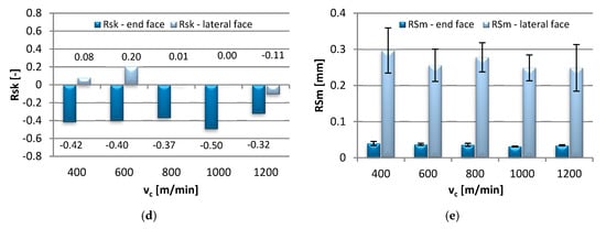 Table 6 presents the results from the statistical analysis of the end-face 2D surface roughness parameters of the specimens subjected to milling with the variable cutting speed vc. The lowest (vc = 400 m/min) and the highest speeds (vc = 1200 m/min) were considered.