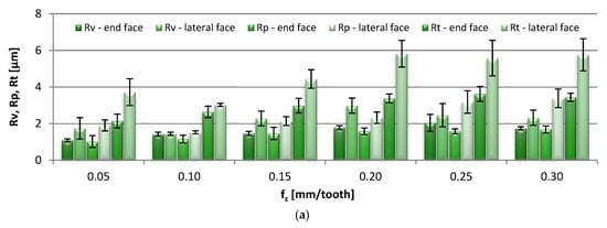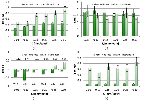 The bar charts in Figure 3 represent the effects that the feed per tooth adjustment, fz = 0.05–0.30 mm/tooth, had on the end-face and the lateral-face 2D surface roughness parameters.