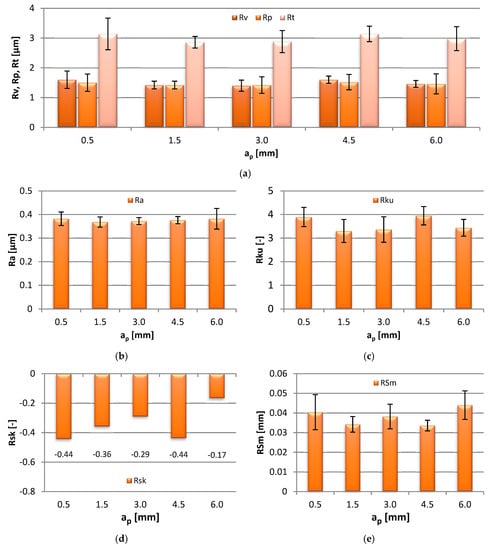 Effect of axial depth of cut ap change on: (a) Rv, Rp, Rt, (b) Ra, (c) Rku, (d) Rsk and (e) RSm parameter (vc = 800 m/min, fz = 0.15 mm/tooth).