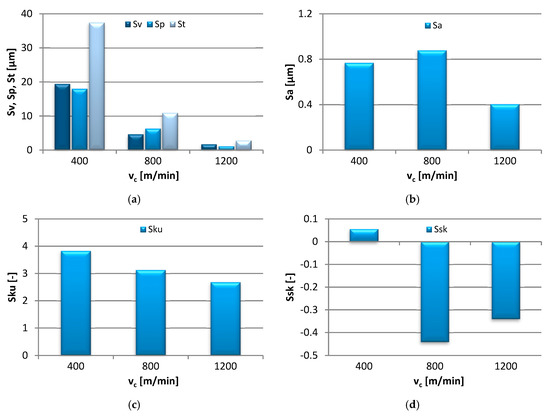 Effect of cutting speed vc change on: (a) Sv, Sp, St, (b) Sa, (c) Sku and (d) Ssk parameter (fz = 0.15 mm/tooth, ap = 6 mm).