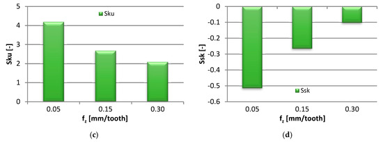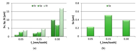 Figure 6 presents the effect of increasing the feed per tooth, from 0.05 to 0.30 mm/tooth, on the end-face 3D area roughness parameters of the specimens. The results are shown as bar graphs.