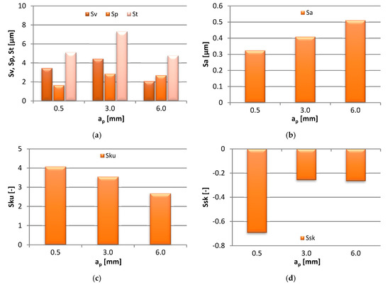 Effect of axial depth of cut ap change on: (a) Sv, Sp, St, (b) Sa, (c) Sku and (d) Ssk parameter (vc = 800 m/min, fz = 0.15 mm/tooth).