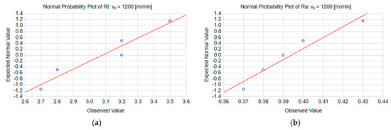 Normal probability plots for the parameters: (a) Rt and (b) Ra at the cutting speed vc = 1200 m/min.
