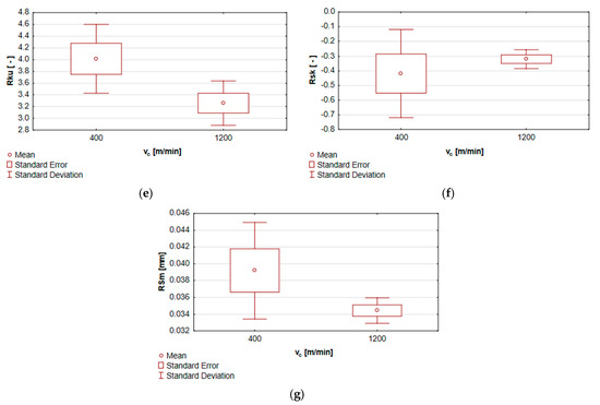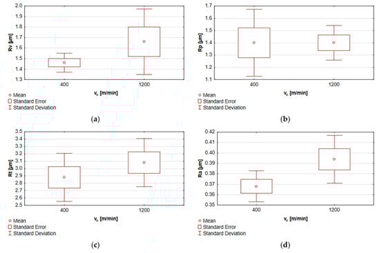 Figure 9 contains the box and whisker graphs accounting for the results from the tests of equality of means describing the end-face 2D surface roughness parameters of the specimens subjected to milling with varying cutting speeds.