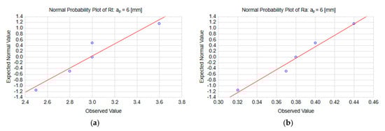 Normal probability plots for the parameters: (a) Rt and (b) Ra at the axial depth of cut ap = 6 mm.