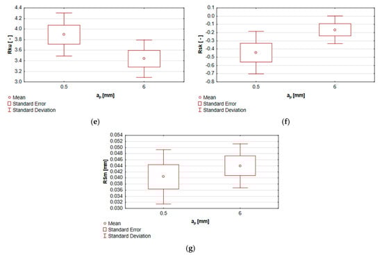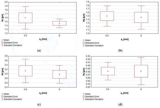 The results from the tests of equality of means describing the end-face 2D surface roughness of specimens subjected to milling with the variable axial depth of cut ap are presented in Figure 11, in the form of the box and whisker graphs.