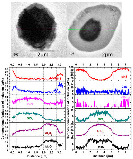 - Type-1 inclusions include pure oxides, as illustrated in Figure 10a, and the complex oxide–sulfide inclusions, as illustrated in Figure 10b. The pure oxides were formed during the refining process or precipitated during the cooling process. The inclusions in Figure 10b composed of oxides and CaS formed during the transformation process of inclusions as reaction [4]. The generated CaS dissolved in the oxides, and the solubility degree of CaS in calcium aluminate was high;