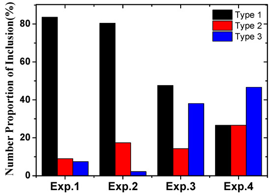 The proportion of typical three kinds of inclusions in different experiments is illustrated in Figure 3. It is obvious that the experiments with low sulfur were rich in Type-1 inclusions and those with high sulfur were rich in Type-3 inclusions. The proportion of single-phased inclusions (Type-1 inclusion) was higher in the high Ca-containing experiments.