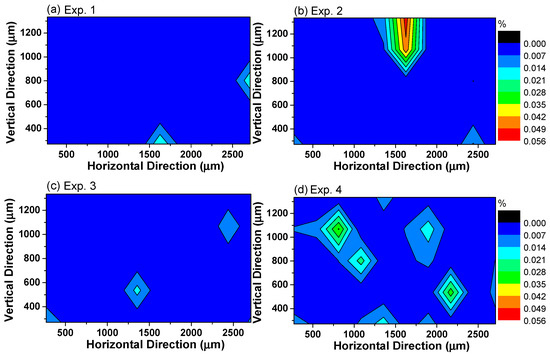 In order to study the distribution of inclusions in 95CrMo steel, the area of inclusions and their coordinates were measured by Image software combining with SEM detection. The area density (Ad) distribution of inclusions on the cross section in each experiment is shown in Figure 8. The Ad value is equal to , i.e., the ratio of inclusion area and steel sample area. The inclusions seriously segregated in certain parts of the steel for Experiment 2 in which the largest area density of inclusions accounted for 0.049 to 0.056 pct. The inclusions were prone to segregate in Experiments 2 and 4 in which the number density of inclusions is large, indicating that the more inclusions there are, the more easily they aggregate and collide. Moreover, it is presumably concluded that the formation of sulfide in the outer layer of oxide inclusions weakens the attraction between oxide inclusions, and thus the inclusions in molten steel or semi-solidification steel with less sulfide tend to attract each other and aggregate strongly.