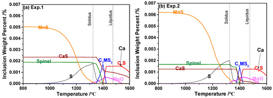 The sulfide inclusions formed in the order of CaS > MnS. CaS formed in the molten steel or two-phase region of steel which adhered to the oxides (this type of inclusion can be seen in Figure 1h,i and Figure 2e), resulting in the coarsening of inclusions. The precipitation temperature of the CaS phase was higher in the steel containing high Ca and its amount increased with the increasing concentration of Ca and S. The thermodynamic calculated results suggest that the steel started to solidify from about 147 °C at which γ-Fe formed and S element segregated in austenite phase gradually during this process. The content of S in austenite phase increased sharply from about 1350 °C which promoted the formation of MnS inclusions. The amount of MnS inclusions kept increasing with the decreasing temperature. However, the concentration of S decreased with the increasing amount of precipitated MnS after the temperature of steel was lower than solidus temperature. In addition, it is found that the segregation of S in γ-Fe only promote the formation of MnS not CaS. The reason why the outer layer of multi-phased inclusions containing MnS was thicker than those containing CaS can be attributed to the fact that the amount of precipitated MnS was much larger than of CaS. Furthermore, the amount of MnS was obviously larger in the experiments with higher S concentration, which resulted in a higher proportion of inclusion with multi-phases in Experiments 3 and 4. The proportion of Type-3 inclusions was higher in high Ca-containing steel attributed to a larger amount of precipitated CaS phase.