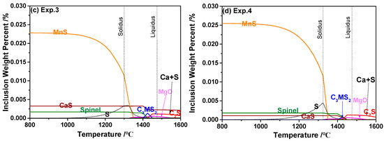 The equilibrium precipitation of inclusions during cooling of 95CrMo was estimated by Factsage 7.2 with FToxid, FactPS, and FSstel data bases based on the steel compositions in Table 1, as displayed in Figure 9, and the adding temperature of Ca and S is marked in Figure 9. The same calculated method can be found in many studies [28,38,39]. However, the calculation by Factsage 7.2 is based on a normal equilibrium cooling model, and thus there may be a deviation of the calculation for temperature below solidus. It can be seen that the inclusions composed of Ca2SiO4, MgO, and CaS precipitated firstly in molten steel, which were transformed into Ca3MgSi2O8 during the solidification process of steel, and subsequently the inclusions composed of spinel and CaS formed and their amount increased due to the reaction [4]. Therefore, it can be concluded that the equilibrated transformation trajectory of inclusions in 95CrMo steel during the cooling process was Ca2SiO4 + MgO → Ca3MgSi2O8 → Spinel + CaS, which was corresponding to the detected Type-1 inclusions. The amount of spinel increased in the order of Experiment 2 = Experiment 3 < Experiment 4 < Experiment 1, which was in good agreement with the detected MgO content in oxides inclusions in Figure 4. Furthermore, the spinel and CaS formed during a solidification process tend to be small because the inclusions are hard to aggregate and collide in the melts with high viscosity. This meets the experimental results in Figure 1a–d where the inclusions composed of spinel and CaS had a small size of no more than 1.5 μm. The calculated results indicate that there were no inclusions containing Al2O3 except for spinel formed during the cooling process of 95CrMo, but the pure Al2O3 was observed in the billets experimentally. This is due to pure Al2O3 forming during the refining process and not having been modified.