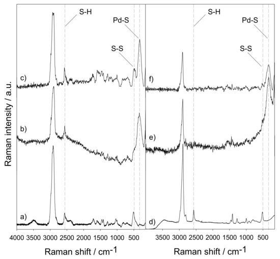 The existence of organic bridges in the structure was proven by diffuse reflectance infrared Fourier transform spectroscopy (DRIFTS). Thus, bands at 1276, 1411, 2900 and 2978 cm−1 were assigned to C-H vibrations of the ethylene bridges (Figure S4) [49]. In addition, a tiny peak from S-H stretching vibrations can be observed at ca. 2560 cm−1 in SH-PMO and SH-E-PMO materials. The presence of S-H groups was clearly confirmed by Raman spectroscopy (Figure 2). Thus, the band at 2570 cm−1 was assigned to S-H stretching vibrations. Moreover, the band at 520 cm−1 corresponded to S-S vibrations, which indicates that sulfur is present both in thiol and in disulfide groups. These latter are formed by the oxidation of two thiol groups. The reaction happens spontaneously and is unavoidable in an environment containing oxygen. Furthermore, this technique allowed Pd-S bonds to be detected as revealed by the presence of a band at 330 cm−1 [50].