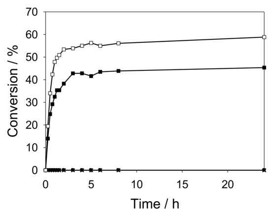 Overall conversion (mol%) in the Suzuki cross-coupling reaction of bromobenzene and phenylboronic acid: Pd-SH-PMO (●), Pd-SH-PMO(H2) (○), Pd-SH-E-PMO (■), Pd-SH-E-PMO(H2) (□), blank (x). Note: The conversion was null in the blank reaction and when Pd-SH-PMO and Pd-SH-PMO(H2) catalysts were used.