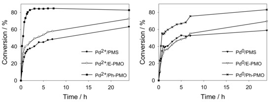 In order to compare their activities with other non-functionalized Pd-containing PMOs, three catalysts consisting of 1 wt% Pd on three supports, i.e., periodic mesoporous silica (Pd2+/PMS), ethylene-bridged periodic mesoporous organosilica (Pd2+/E-PMO) and phenylene-bridged periodic mesoporous organosilica (Pd2+/Ph-PMO), were tested under the same reaction conditions (Figure 4, left). The last one was the most active and provided a conversion above 80% in 1.5 h. Pd2+/E-PMO and Pd2+/PMS gave rise to a lower activity, in particular, the latter one. On the other hand, these three materials were reduced under a hydrogen stream at 200 °C. Under these conditions, Pd2+ is reduced to Pd0 [47]. The reduced catalysts were also used for the Suzuki reaction and exhibited a similar conversion to the unreduced catalysts, except for the Ph-PMO support, which presented a slightly lower reaction rate even though after 24 h it gave the same conversion (Figure 4, right). As indicated above, the same reduction treatment was applied to materials Pd-SH-PMO and Pd-SH-E-PMO. However, the use of different techniques, such as TEM (Figure 2) and XPS (Figure S5), provided no evidence of the reduction of Pd2+ to Pd0 in these materials. The hydrogen-treated Pd-SH-PMO material remained completely inactive. On the contrary, the hydrogen-treated Pd-SH-E-PMO material provided a higher conversion than the untreated material (Figure 3). This increase in catalytic activity may be due to the fact that the treatment with hydrogen at high temperature causes a distortion in the structure that makes palladium passes more easily to solution and, as a consequence, the conversion obtained with this material is higher.
